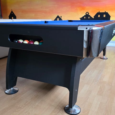 Super godt poolbord i 76x154 cm som har tjent os i mange gode poolspil gennem tiderne. Benene kan skrues af så bordet kan opmagasineres i perioder hvor det ikke bruges.