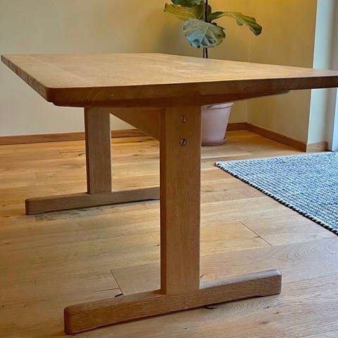 Massivt egebord fra Fredericia Stolefabrik i god stand, men med patina og lidt spor af brug. Står fint. Sendes ikke. Fast pris