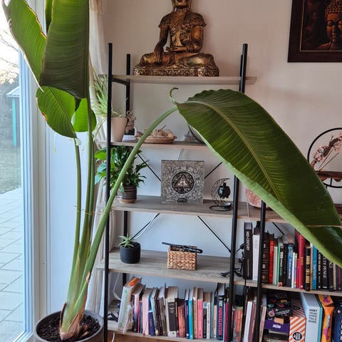 Meget stor og frodig plante med to skud, der kan plantes for sig. Plastpotte og underfad medfølger. Plante inkl. potte er ca. 2,5 meter i højden. Ca. 5 år gammel. Har nyt blad på vej og skyder nye med et par måneders mellemrum.