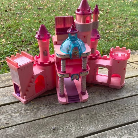 My Little Pony slot med figurer og tilbehør i lilla og lyserøde nuancer. Legesættet består af et fleretagers slot med tårne, altaner og detaljerede rum både foran og bagpå. Medfølgende dele omfatter flere ponyfigurer samt mindre tilbehør som vogn, møbler og små rekvisitter, der kan placeres rundt omkring i slottet. Egnet til rolleleg og fantasileg med My Little Pony universet.