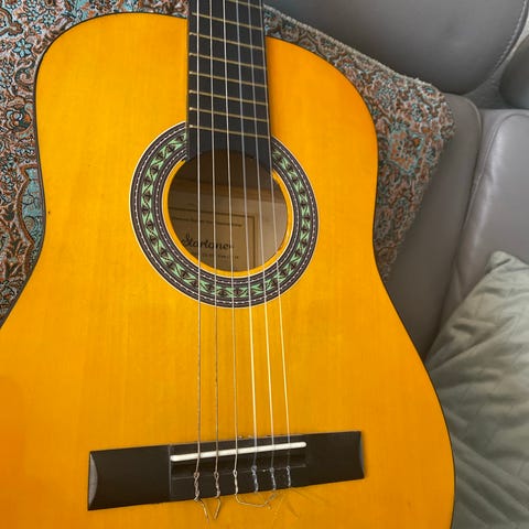 Akustisk junior guitar i klassisk model med naturfarvet dæk og mørk bagside og hals. Guitaren har seks strenge og traditionel rund lydhulroset. Egnet til fingerspil og akkordspil i akustiske sammenhænge. Velegnet som øve- og begynderinstrument eller som ekstra guitar til hjemmet.