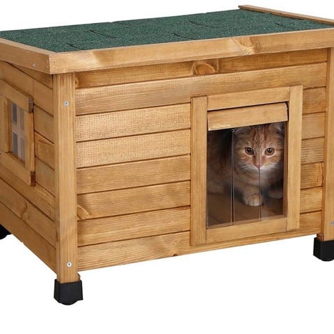Udendørs kattevoliere med flere niveauer og integrerede hylder. Volieren er udført i ramme af hårdt materiale med netsektioner, som giver katten mulighed for at opholde sig sikkert udendørs. Konstruktionen har flere etager og små ramper/åbninger, så katten kan bevæge sig mellem niveauerne. Velegnet til brug i have eller på terrasse som sikker udendørs løsning til katteophold