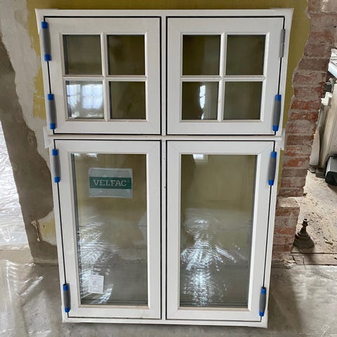 Vinduer i hvid ramme med sprosser. Vinduerne fremstår som faste/sidehængte elementer i flere sammenhængende fag, velegnet til fx udestue eller facadeparti. Hvid kode 9010 udvendig alu og indvenig træ. Kan anvendes til udskiftning eller opbygning af nye vinduespartier i bolig eller udestue, afhængigt af mål og tilpasning på stedet. Demonteres i uge 11-2026. Sælges helst samlet.