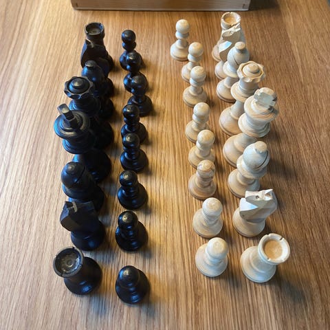 Skaksæt med brikker i træ i farverne sort og natur. Sættet består af komplette skakbrikker til to spillere. Brikkerne er formet i klassisk stil og egner sig til brug på et standard skakbræt. Velegnet til både hyggespil derhjemme og til øvelse i skakspil. kongen er 7 cm