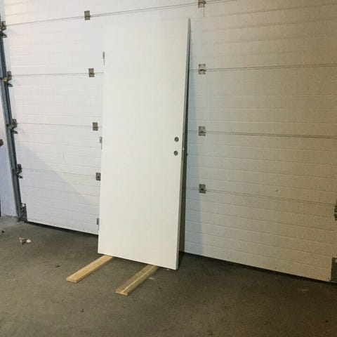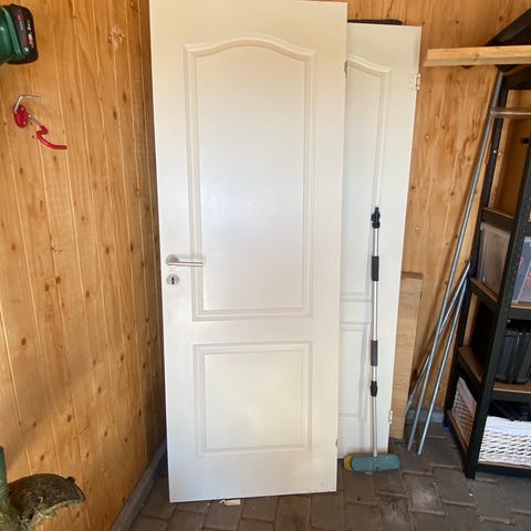 Indvendig dør i går farve. Døren har glat overflade og er udstyret med dørgreb og låsekasse.