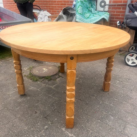 Cirkulært spisebord af massiv eg med udskårne ben og 1 tillægsplade.