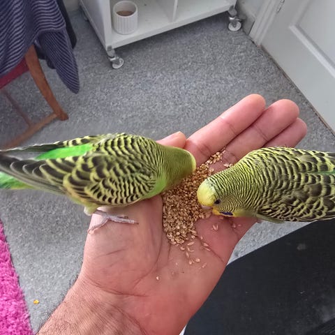 De er tamme i den forstand at de gerne sidder på hånden i buret. Den gule kan godt finde på at lande på ens skulder når de er ude. De kan sagtens blive mere tamme.