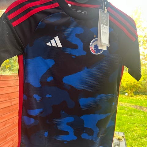 Adidas FCK målmandstrøje til børn i størrelse 146. Langærmet fodboldtrøje i blå og sort med polstring på ærmerne. Fremstillet i let, åndbart ClimaCool-materiale egnet til fodboldtræning og -kamp. Velegnet til børn omkring str. 146, designet som målmandstrøje med klublogo på brystet.
