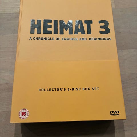 Heimat dvd boks. Indeholder flere dvd-diske i samlet boksudgave af serien/filmen "Heimat". Omslag og skiver har ensartet mørkegrønt design med titeltryk.