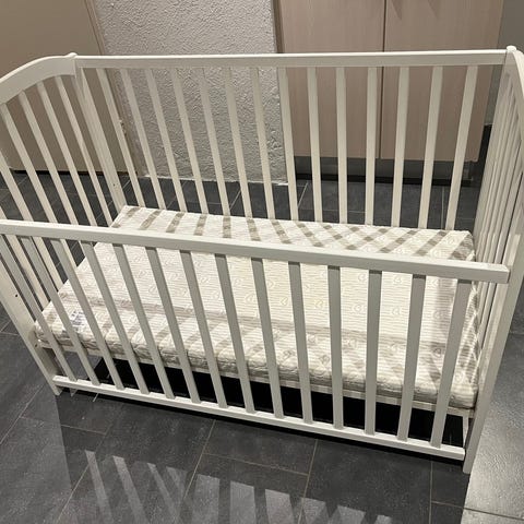 BabySam tremmeseng i hvid. Klassisk tremmeseng med lamelbund og faste gavle. Sengen er velegnet til spædbørn, småbørn og kan bruges som seng på børneværelset. Tremmesengen kan løbende tilpasses i takt med, at barnet vokser – med høj bund, lav bund, høj side, lav side og ingen side. Leveres som vist på billederne med bund, madras, topmadras og justerbar tremmevæg.