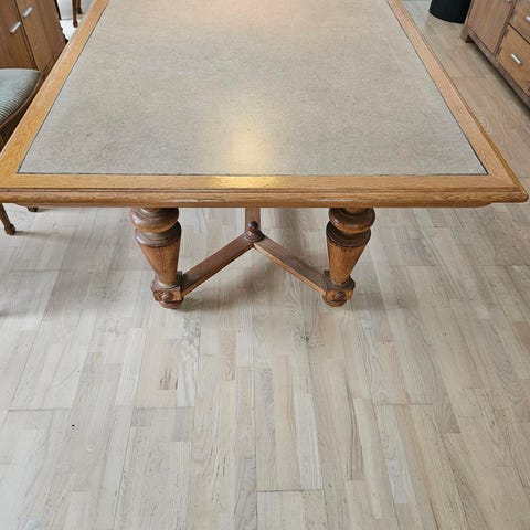 Smukt retro spisebord i massivt træ med flot åretegning og solid kvalitet. Perfekt til både hverdag og store middage.