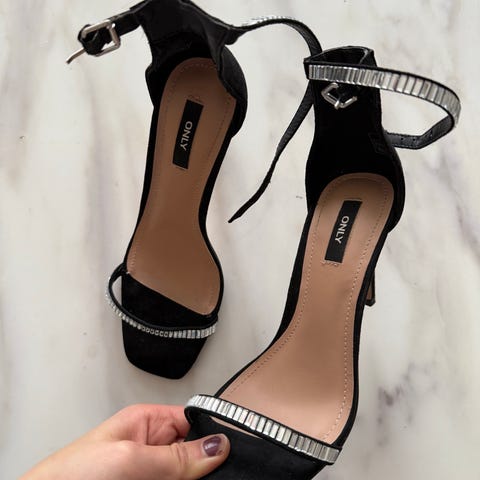 Højhælede sko i størrelse 36 i sort med blondedetaljer. Skoene har åben tå og høj, smal hæl. Overdelen er i blondestof med lynlås bagpå, som gør dem nemme at tage af og på. Velegnet som damesko til fest og andre lejligheder, hvor der ønskes en højhælet model med blondelook.