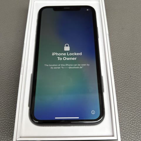 På billederne ses telefonen både i æske og der medfølger et slidt separat cover som kortholder