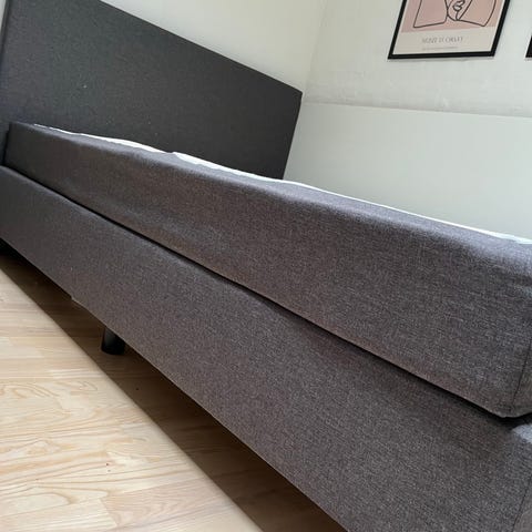 Jysk seng med madras i grå farve. Sengen har lamelbund og polstret ramme. Velegnet som seng i soveværelse, gæsteværelse eller ungdomsværelse. Mål 140 * 200