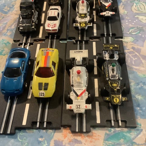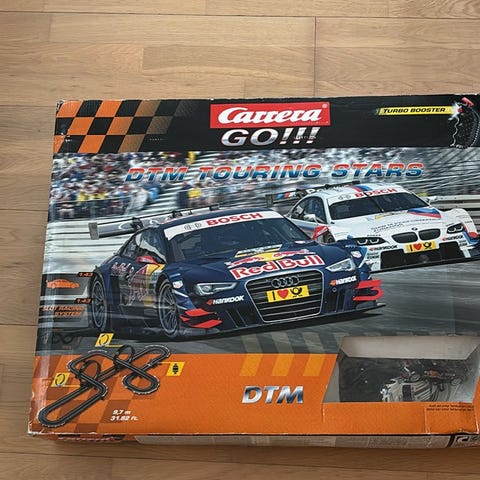 Bilbanesæt med to racerbiler og elektrisk styring. Sættet består af sorte banedele med dobbelte spor, der kan samles til en længere bane med blandt andet loop-sektion. Medfølgende røde og blå racerbiler kører i hver sit spor og styres via håndholdte controllere, som tilsluttes strømforsyningen. Der følger ekstra kurvestykker og beslag med til opbygning og stabilisering af banen. Egnet som legetøj til indendørs brug.