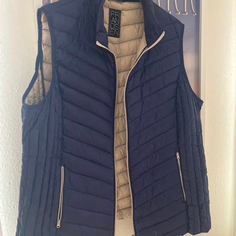 Smart og farverig vest med dunfyld fra Danefæ, se mål mm. på fotos. Meget lækker kvalitet.