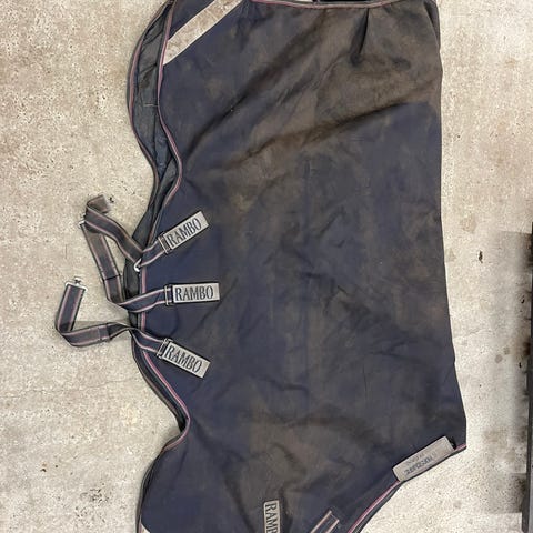 Horseware Rambo Duo hestedækken i farven navy/sky blue/brown. Modellen er 130 cm (6’0 / str. 72 / ca. 183 cm) og leveres i original Horseware-opbevaringstaske. Dækkenet er et kombinationsdækken med aftagelige dele, velegnet til brug på hest i forskellige vejrforhold. Justerbare stropper og spænder giver mulighed for tilpasning til hestens størrelse og facon.