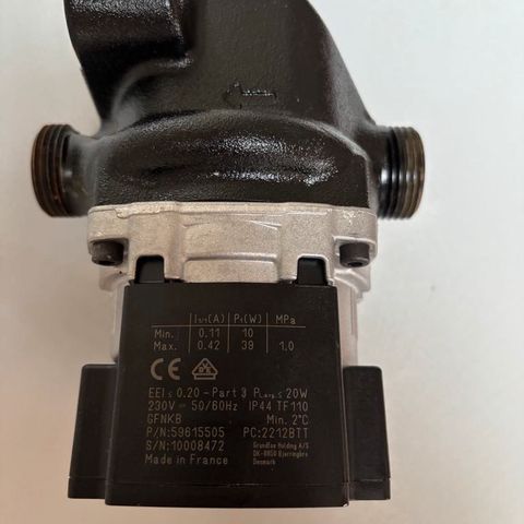 Cirkulationspumpe til varmeanlæg i blå og sort. Pumpen er monteret med tilslutningsfittings i metal, egnet til brug i varme- eller brugsvandsinstallationer afhængigt af specifikationer. Enheden er beregnet til cirkulation af vand i lukkede rørsystemer, f.eks. i centralvarme- eller gulvvarmeanlæg. Nærmere tekniske data som effekt, tryktrin og rørdimensioner fremgår normalt af typeskiltet på pumpen. Har været monteret, men der har aldrig været vand i.