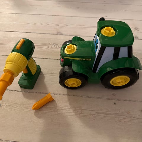 John Deere legetraktor byggesæt i grøn og gul plastik. Sættet består af en traktor, der kan skilles ad og samles igen ved hjælp af den medfølgende legetøjsboremaskine og skruer. Delene omfatter blandt andet traktorens karrosseri, førerhus, hjul og flere skruer, som barnet kan montere. Egnet som konstruktions- og rollelegelegetøj til børn, der kan lide traktorer og værktøj. Plastmateriale, let at håndtere for mindre børn.