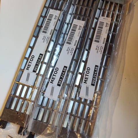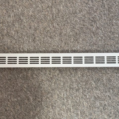 Ventilgitter til ventilation i sort metal. Af langt, rektangulært design med lameller og skruehuller til montering. Egnet til brug i døre, skabe eller andre møbler, hvor der er behov for luftcirkulation eller udluftning. Leveres med beskyttende plastemballage.