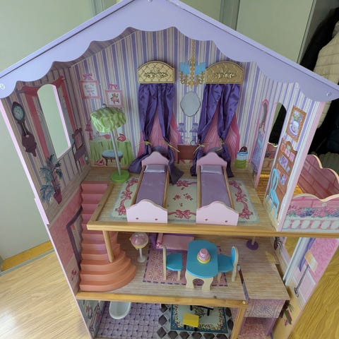 Minjio design dukkehus i træ finer med hvid og træfarvet overflade. Huset er i to etager med åbne sider, så rummene er let tilgængelige. Indvendigt er der indrettet med møbler som seng, vugge, sofa, bord, stole og andre små dele, der kan bruges til leg og indretning. Velegnet til leg med dukker og figurer i mindre størrelse og til rolleleg i hjemmemiljø.