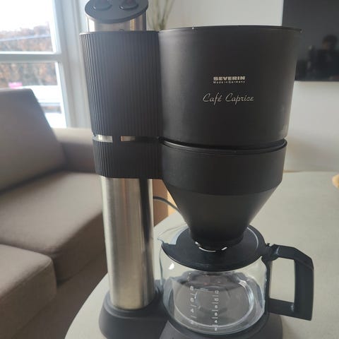 Severin kaffemaskine med glaskande og genanvendeligt filterindsats.