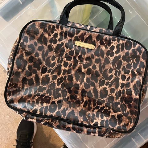 Victoria's Secret toilettaske i plast til unisex brug. Tasken har lynlåslukning øverst og et enkelt hovedrum, der egner sig til opbevaring af toiletartikler, makeup eller småting. Overfladen har et stribet, glitrende design med Victoria's Secret-logo på fronten.