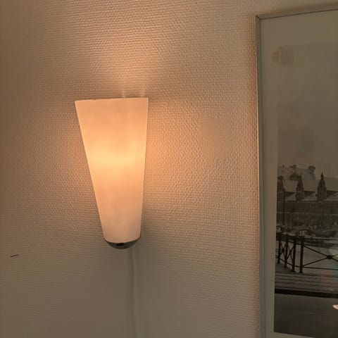 To væglamper, har ikke været i brug, samt to ekstra skærme i glas - sælges samlet