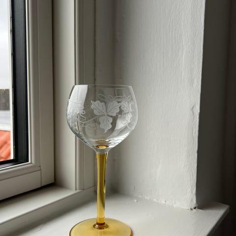 vinglas med rund bowle i klart glas og grøn fod. Glassene har dekoration med graveret drue- og bladmønster på bowlen og en riflet stilk i mørkegrønt glas, som går over i en rund grøn fod. Velegnet til servering af vin eller andre kolde drikke. Sælges som sæt, som vist påbilledet