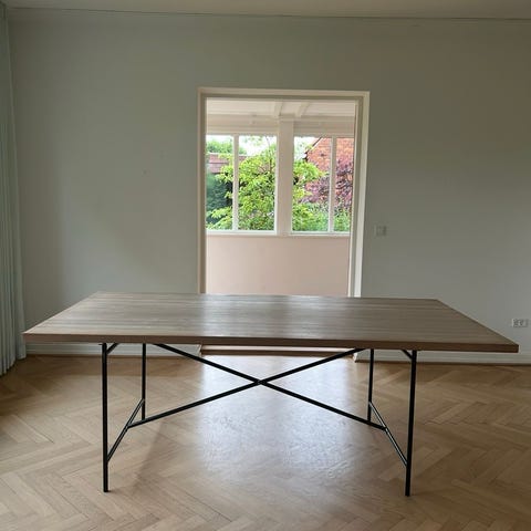 Er brugt men da bordpladen er enorm slidstærk, så står bordet næsten som nyt.