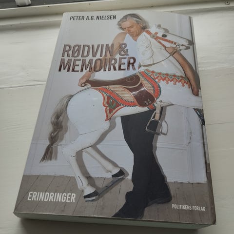 Peter A.G. Nielsen Rødvin & Memoirer bog. Dansk sproget bog med erindringer/memoirer af musikeren og forfatteren Peter A.G. Nielsen. Paperback/hæftet udgave med forsideillustration af forfatteren med en hvid gyngehest. Velegnet til læsere med interesse for biografier og personlige fortællinger på dansk.