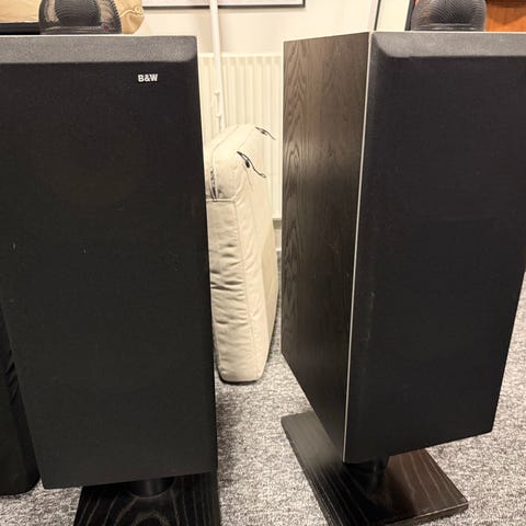 Bowers & Wilkins M1 højttalere i hvidt design. Kompakte højttalere monteret på integrerede fodstativer med kromfinish. Egnede som stereo- eller surroundhøjttalere i stue, kontor eller hjemmebiograf. Tilsluttes via traditionelle højttalerkabler i foden.