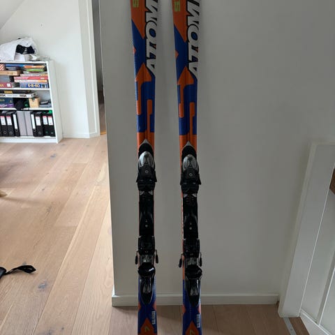 Head Cyber Race alpinski i blå farve. Skiene har integrerede bindinger, som kan justeres efter støvlestørrelse. Egnede til alpint skiløb på pister. Konstruktionen fremgår som "Carbon Race" på skiene.