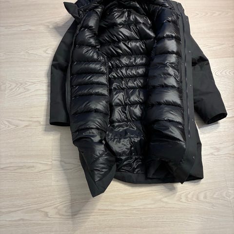Jakken er sort og fremstillet med Gore-Tex-materiale, som giver en vind- og vandtæt yderside. Modellen har gennemgående tovejs-lynlås med vindstolpe, hætte og indvendige samt udvendige lommer med lynlås. Velegnet som varm og beskyttende overtøjsjakke i koldt og vådt vejr.