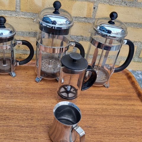 1 liter Bodum stempelkande 75 kr og 0,35 liter Bodum stempelkande 50 kr.