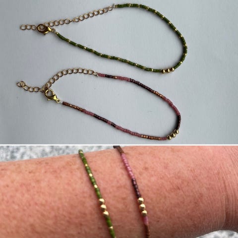 Armbåndet består af små grønne perler på elastik, som gør det nemt at tage af og på og tilpasser sig håndleddet. Velegnet til daglig brug eller som enkelt tilbehør til forskellige outfits.