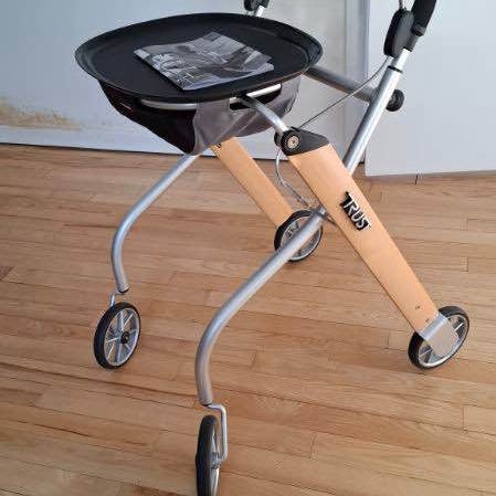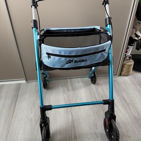 Actumplus Space rollator i farven Champagne med sæde og kurv i sort. Rollatoren har fire hjul og håndbremser på begge håndtag. Leveres med brugervejledning som vist på billedet.