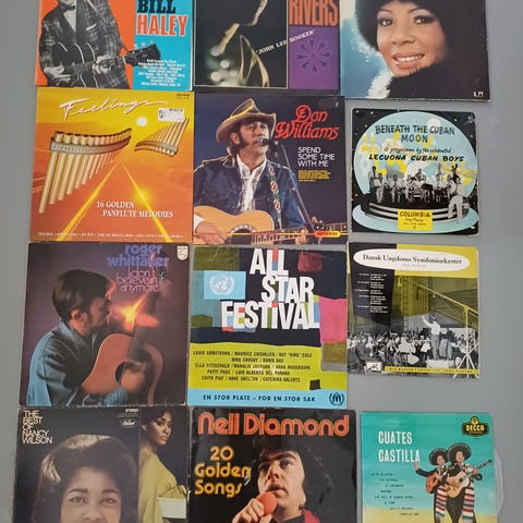 Blandet lot vinylplader og singler. Samlingen omfatter både LP’er og 7"-singler med forskellige kunstnere og genrer, herunder pop, rock, schlager og easy listening. Omslagene viser, at der er både internationale og skandinaviske udgivelser. Velegnet til køber, der ønsker en samlet pakke med ældre vinyludgivelser til samling eller afspilning. Antal titler og specifikke udgivelser fremgår af billederne.