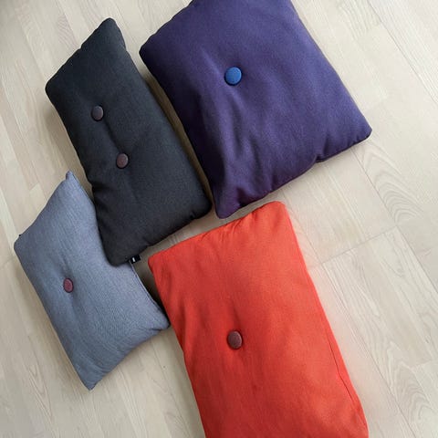 Hay rektangulære puder i to farver: én rød og én mørkelilla. Begge puder har en centralt placeret knap i kontrastfarve på forsiden og lille Hay-mærke i siden. Velegnede som pyntepuder til sofa, stol eller seng i stue eller soveværelse.
