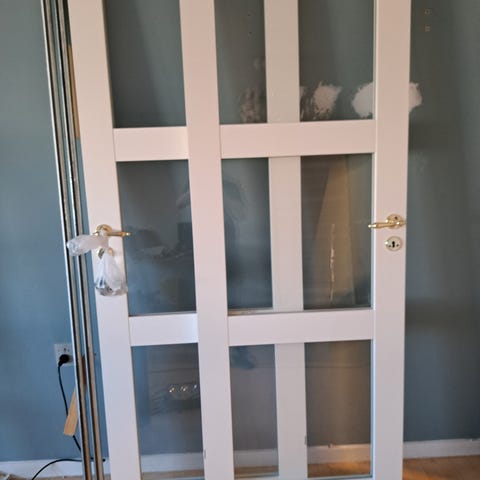Skydedør i glas med sort metalramme og sprosser. Døren er monteret på skinne øverst og kører langs væggen som en skydedørsløsning. Designet giver lysgennemgang mellem rum samtidig med adskillelse. Egnet til indendørs brug, f.eks. mellem stue, køkken eller gang. Rammen er udført i metal med flere glasfelter, og skinnen er placeret over døråbningen langs væggen.