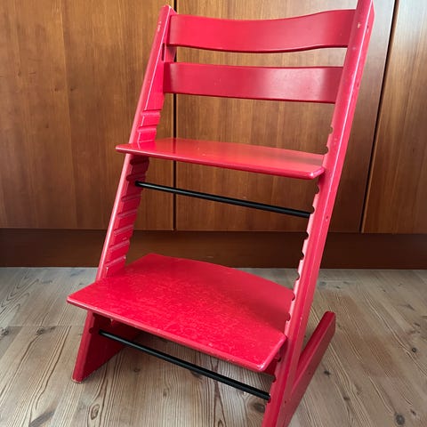 Stokke new born seat til tripp trapp-stol. En anden model end mange af de Andre new born seats fra Stokke, men vi har været gladest for denne, da hældningen er mere stejl, og barnet derfor bedre kan følge med omkring spisebordet.