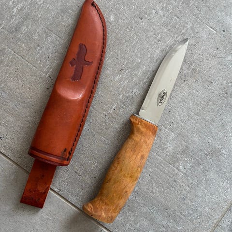 Klingelængden er ca. 95mm og klingen er i Helle's tre-lagsstål. Skæftet er i olieret birketræ og med et supergodt greb. Skede i sort læder med trykknaplås så kniven sidder sikkert fast.