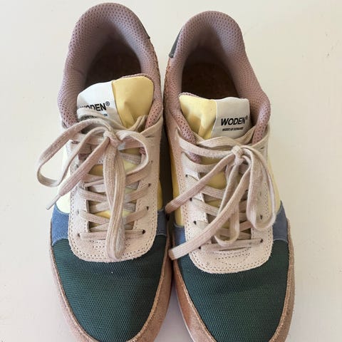 & Other Stories sneakers i str. 46. Modellen er lave sneakers med snørelukning. Skoene er overvejende lyse med kontrastdetaljer og mønstrede snørebånd. Velegnede som hverdagssko eller fritidssko. Materiale er blandet tekstil og syntetisk/læder-look (præcist materiale ikke angivet).