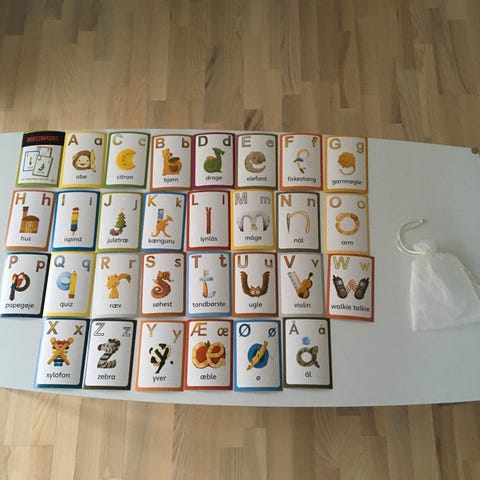 Indeholder 194 kort: 2 x 28 alfabetkort (røde vokaler og blå konsonanter), 64 konsonantklyngekort og 70 ordkort med lydrette ord på op til to bogstaver (hvor illustrationen på forsiden af kortet er stavet på bagsiden). Hvis ikke regnestykket går op, er det fordi vi har lagt ekstra 'blanke' kort i æsken.
