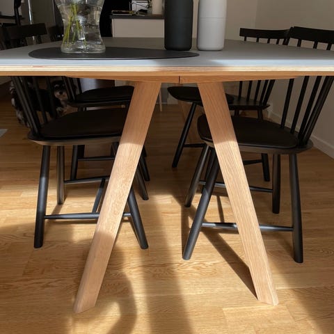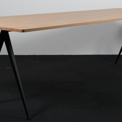 Hay spisebord med plade af massiv lysolieret eg. Stel af pulverlakeret stål. H. 74 B. 86 L. 300 cm. Udstillingsmodel, med minimale brugsspor.