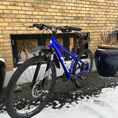 Mountainbike børnecykel med 24" hjul. Cyklen har sort stel med blå detaljer og er udstyret med skærme, lygter og forgaffel med affjedring og lås. Styret har håndbremser og der er fodbremse også. Egnet som junior- eller børnecykel for 1-3 klasse (ca).