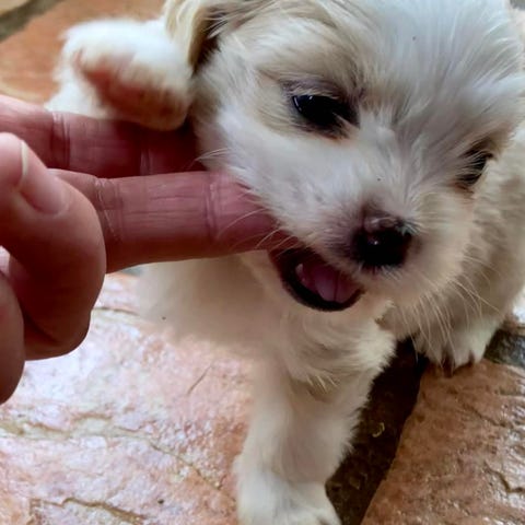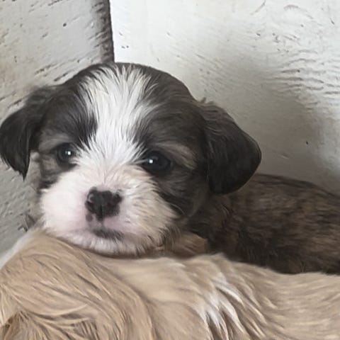 Far er en flot mørk Bichon havanais og vejer ca 6 kg.