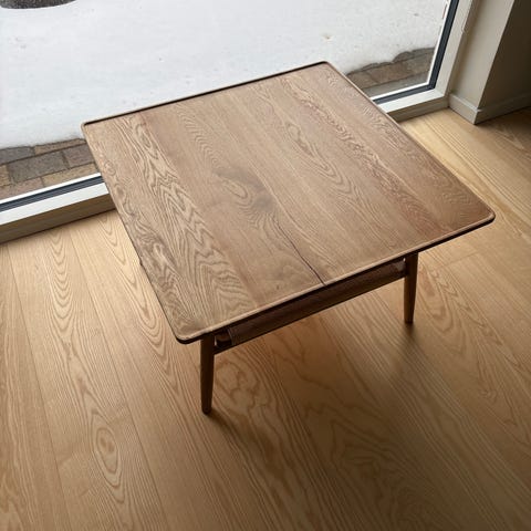 Flot bord i eg. Bordpladen er lavet af MDF/finer og flethylde i papirsnor.