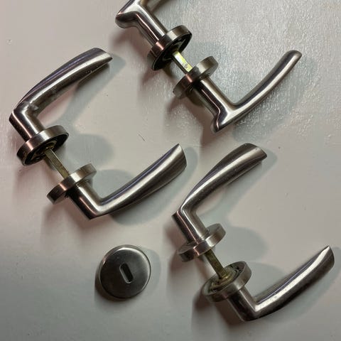 L-formet Dørgreb Randi 7021 Line 18 i børstet rustfrit stål. Sættet indeholder flere komplette greb med tilhørende rosetter og monteringsdele, pakket enkeltvis i plastposer.