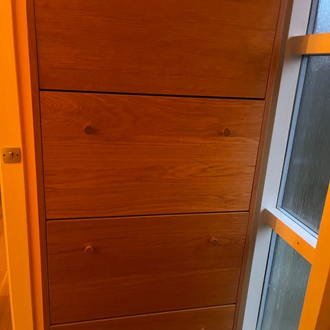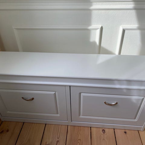 Skoreolen hænges op på væggen og har to rækker til sko. Ved at hænge skoreolen højt på væggen, kan der gøres plads til sko under den.